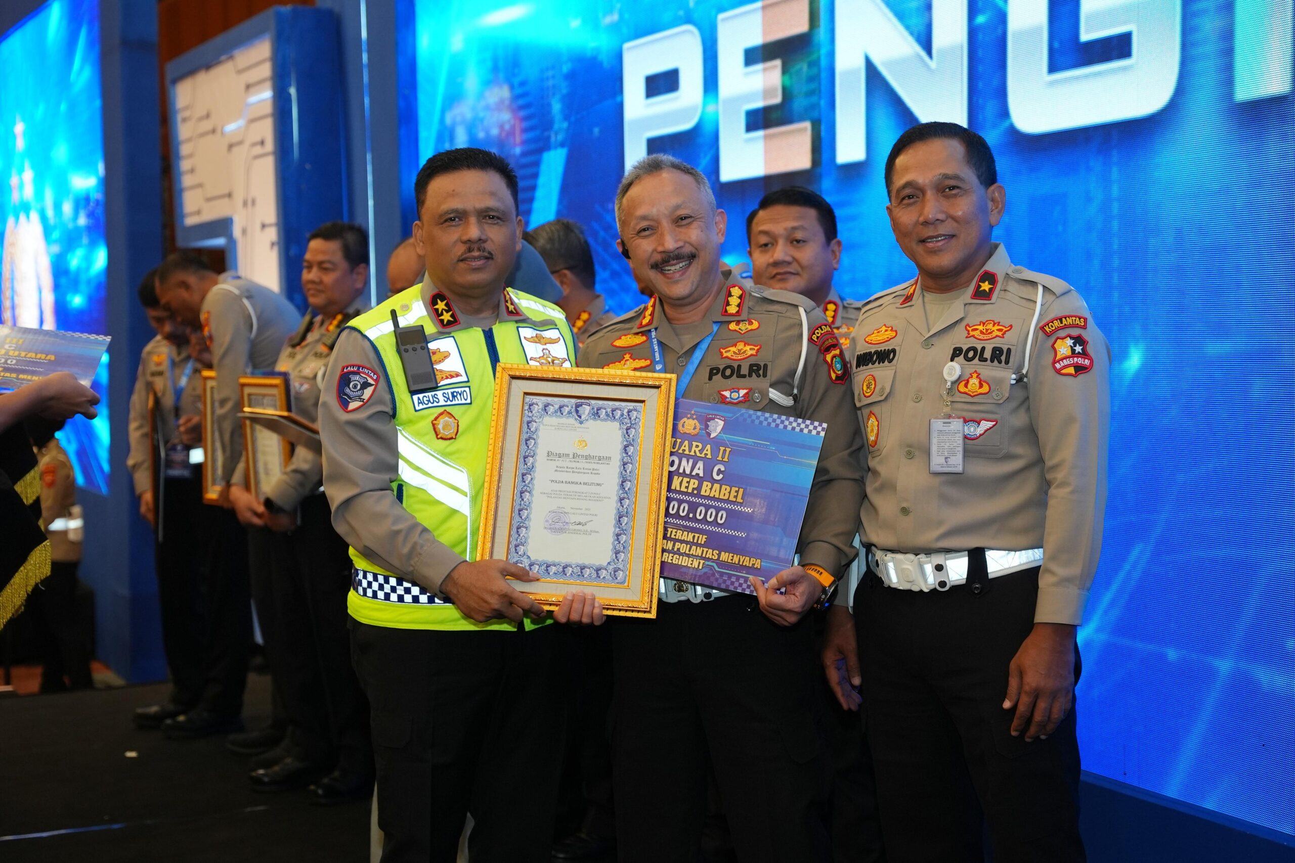 Penghargaan tersebut diserahkan langsung oleh Kakorlantas Polri Irjen Pol Agus Suryo Nugroho kepada Dirlantas Polda Babel, Kombes Pol Pringadhi Supardjan, dalam kegiatan Rapat Evaluasi Tugas Bidang Regident dan Rakernis Gakkum Korlantas Polri Tahun 2025 yang digelar di Bandung, Jawa Barat.