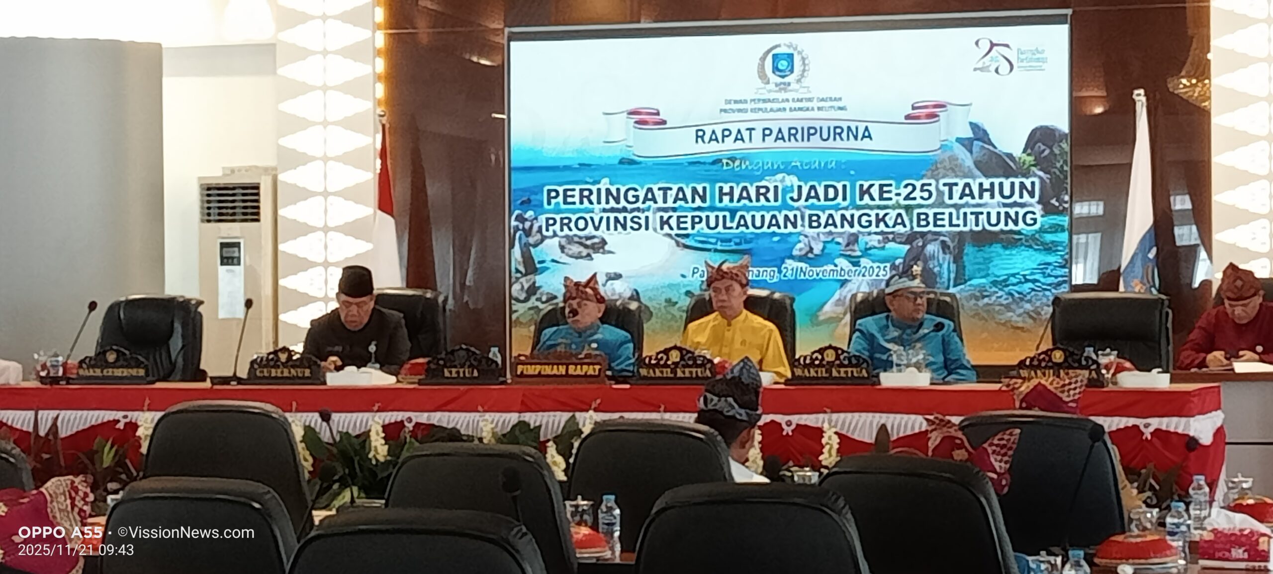 Babel,VissionNews.Com- DPRD Provinsi Bangka Belitung menggelar Rapat Paripurna Istimewa Peringatan Hari Jadi ke-25 Pemerintah Provinsi Kepulauan Bangka Belitung di Gedung Mahligai Rumah Dinas Gubernur, Air Itam Pangkalpinang, Jumat (21/11/2025).