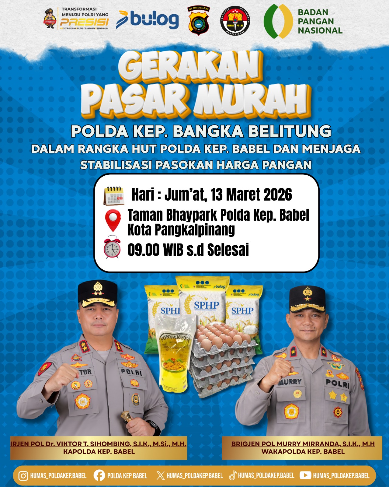 BABEL,VISSIONNEWS.COM- Polda Bangka Belitung kembali mengadakan Gerakan Pangan Murah (GPM) bagi masyarakat. Kegiatan tersebut dijadwalkan berlangsung pada Jumat (13/3/2026) mulai pukul 09.00 WIB di Bhaypark Mapolda Bangka Belitung.