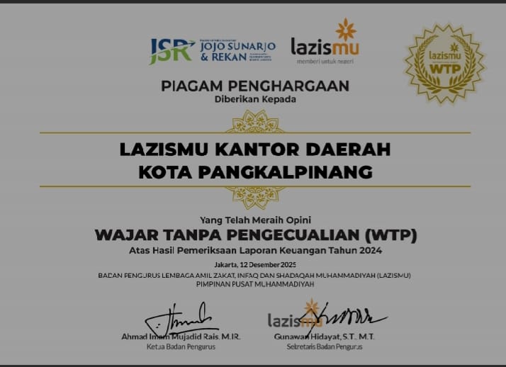 PANGKALPINANG,VISSIONNEWS.COM- Komitmen terhadap tata kelola keuangan yang profesional kembali dibuktikan oleh LAZISMU Kota Pangkalpinang. Lembaga pengelola zakat tersebut berhasil meraih piagam penghargaan Wajar Tanpa Pengecualian (WTP) atas laporan keuangan tahun buku 2024.